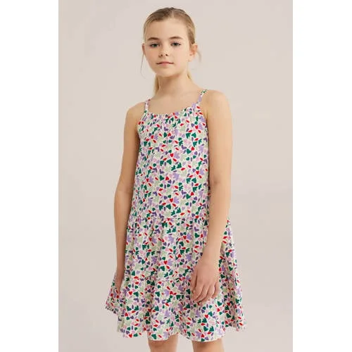 Klaar voor elke draai, sprong en schooldag met deze seersucker jurk voor meisjes. De jurk heeft een luchtig A-lijn model dat soepel meebeweegt, ideaal om in te rennen en spelen. De kleurrijke all-over print in ecru/groen/paars geeft direct een vrolijke uitstraling, terwijl de subtiele plooien extra volume en speelsheid toevoegen. De stretchstof met seersucker structuur voelt licht en comfortabel op de huid, ook op warme dagen.Luchtig design met vrolijke details Gemaakt van 100% katoen, prettig ademend en zacht voor de huid Seersucker kwaliteit met lichte structuur voor een luchtig gevoel Regular fit met mouwloos A-lijn model voor veel bewegingsvrijheid Ronde elastische halslijn en spaghettibandjes die comfortabel aansluiten Midi lengte, geschikt voor peuters, kleuters, schoolkinderen en tieners Kleurrijke all-over print in ecru/groen/paars voor een speelse look Geen sluiting, de jurk wordt eenvoudig over het hoofd aangetrokkenVoor dagelijks spelen en speciale momentenDeze jurk uit de Daily collectie is fijn voor naar school, een speelafspraak of een familiefeest. Door het lichte materiaal en de elastische halslijn is aankleden snel gedaan. Combineer met sandalen of sneakers en een vestje op koelere dagen.WE Fashion voor het hele gezinWE Fashion ontwerpt moderne kleding voor elke dag, met aandacht voor pasvorm en draaggemak. De collecties voor kinderen sluiten goed aan op het actieve leven van jonge dragers. Met deze jurk kies je voor een doordacht ontwerp waar je kind zich vrij in kan bewegen.Een kleurrijke dagelijkse favoriet waar je kind zich de hele dag prettig in voelt.