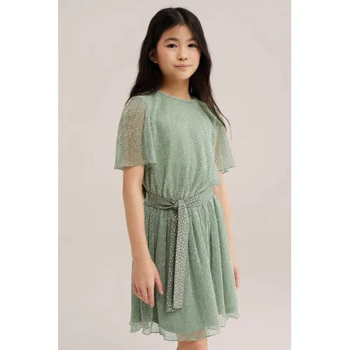 Voor een feestelijke zomerdag of een gewone schooldag met extra glans is deze meisjes plisséjurk een mooie keuze. De jurk heeft een regular fit met een comfortabele onderrok en is gemaakt van een soepele plissé stof in groen, versierd met een all-over print van goudkleurige stippen. De korte, wijde mouwen zijn semi-transparant, wat een luchtig en speels effect geeft.Kenmerken van deze plisséjurk Goudkleurige textuur met subtiele glans voor een feestelijke uitstraling Ronde hals en regular fit, prettig om de hele dag te dragen Korte, wijde mouwen van semi-transparante plissé stof Elastische taille met strikceintuur voor een mooie pasvorm Knoopsluiting op de rug om het aankleden eenvoudig te maken Onderrok zorgt ervoor dat de jurk niet doorschijnt Midi lengte, geschikt voor peuter, kleuter, schoolkind en tiener Geen zakken, waardoor de plissé stof mooi in model blijftGeschikt voor elke dag en speciale momentenDe groene kleur met gouden stippen maakt deze jurk passend voor een verjaardag, familie-etentje of een dag op school. De elastische taille beweegt makkelijk mee, zodat ze vrij kan rennen, dansen en spelen, terwijl de strikceintuur de jurk net wat extra afwerking geeft.WE Fashion voor kidsWE Fashion ontwerpt kinderkleding met aandacht voor pasvorm, draaggemak en een moderne uitstraling. De collecties sluiten aan op het dagelijkse leven van kinderen, met items die er verzorgd uitzien en prettig zitten. Zo combineert WE Fashion trendy details met betrouwbare kwaliteit waar jij en je kind op kunnen rekenen.Een jurk die er verzorgd uitziet en toch comfortabel genoeg is voor elke dag.