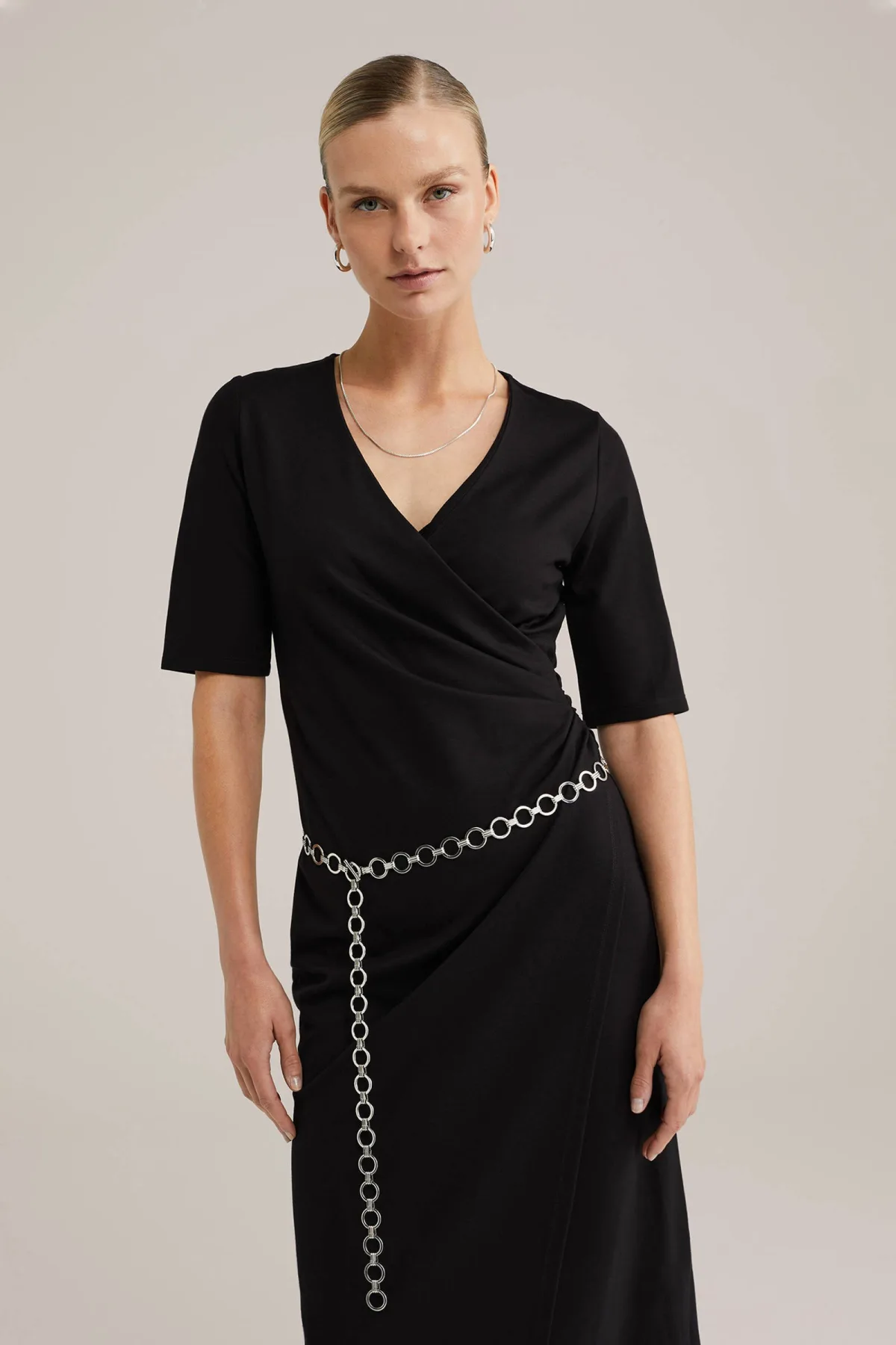Geeft je outfit structuur, zelfs als je dag dat niet heeft. Deze jurk met stretch heeft een V-hals, korte mouwen en een subtiel detail bij de taille. De split zorgt voor net dat beetje drama. Kom perfect voor de dag, zelfs als je ontbijt bestond uit koffie.