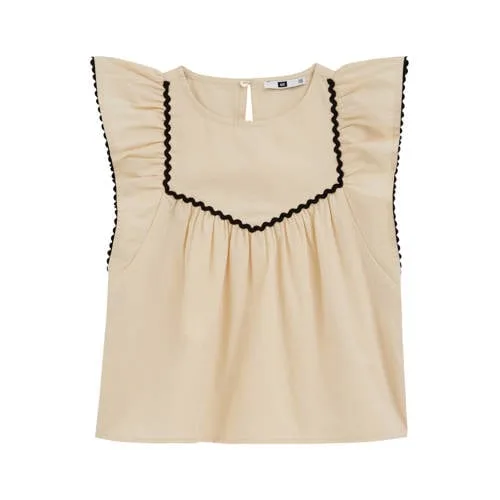 Deze beige meisjes top is een praktische basic met leuke details voor elke dag. De mouwloze top heeft een comfortabele, rechte pasvorm en een ronde hals, waardoor de stof netjes aansluit bij de hals en toch luchtig valt. Het subtiel geplooide borststuk geeft extra ruimte en een speels effect, terwijl de zwarte golvende bies aan de voorkant direct opvalt.Verfijnde details voor dagelijks draagplezier Mouwloze top met ronde hals, ideaal voor warmere dagen of onder een vest Geplooid borststuk voor een mooie, soepele valling Zwarte golvende bies als stijlvol contrast op het beige Losse, wijde fit die veel bewegingsvrijheid biedt Knoopsluiting aan de achterkant zodat de top makkelijk aan en uit gaat Effen kleur die goed te combineren is met shorts, rokjes of een jeans Gemaakt van katoen, wat zacht aanvoelt op de huid Subtiele ruches en contraststiksels voor een verzorgde, moderne lookVeelzijdig in elke kinderkledingkastDeze top past goed bij het dagelijkse leven, of het nu een schooldag, een feestje of een familiedag is. Combineer met een korte broek en sandalen voor zomerse dagen of met een luchtig vest en legging als het wat frisser is.Kindvriendelijke stijl van WE FashionWE Fashion ontwerpt kinderkleding die er modern uitziet en prettig draagt. De aandacht voor pasvorm, materialen en details zorgt ervoor dat kinderen zich vrij kunnen bewegen en zichzelf kunnen zijn, terwijl ouders vertrouwen op goede kwaliteit en een actuele stijl.Een lichte, comfortabele top met nette details, geschikt voor uiteenlopende momenten.