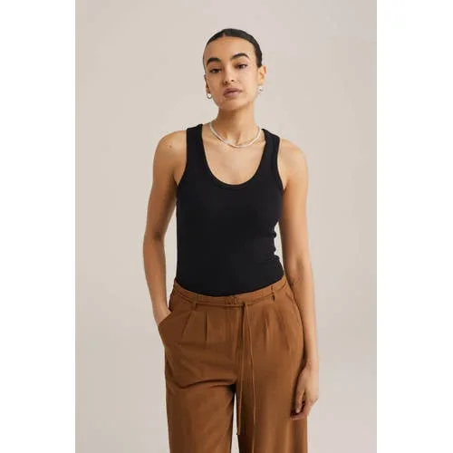 Dé basic die altijd goed zit. Deze fitted tanktop heeft een comfortabele ribstructuur en een flatterende ronde hals. Het item is gemaakt van een zachte stretchstof, zodat je ‘m de hele dag moeiteloos draagt – solo of als laagje onder een blouse.
