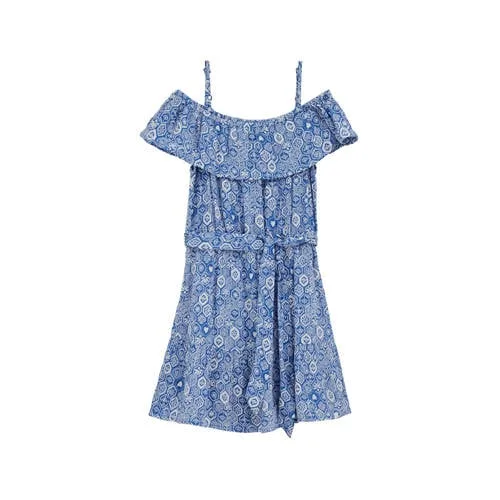 Deze luchtige meisjes jurk met off shoulder halslijn is ideaal voor dagen waarop aankleden snel en eenvoudig mag gaan. De elastische boothals valt mooi over de schouders, terwijl de smalle schouderbandjes alles netjes op zijn plek houden. De blauw-witte all over print geeft de jurk een speelse uitstraling en past perfect bij zonnige dagen, feestjes of gewoon naar school.Details die het verschil maken Off shoulder model met elastische boothals voor een comfortabele pasvorm Spaghettibandjes voor extra zekerheid en een luchtig gevoel Strikceintuur in de taille om de jurk naar wens aan te trekken Lichte, soepelvallende stof van 100% viscose All over print in blauw/wit voor een frisse, vrolijke look Zonder sluiting, zodat de jurk gemakkelijk aan en uit gaat Geen zakken, waardoor de vorm mooi slank en zwierig blijft Geschikt voor peuter, kleuter, schoolkind en tienerFijn voor elke dagDeze jurk uit de Daily collectie is gemaakt om vaak te dragen. De soepele stof voelt zacht aan op de huid en beweegt makkelijk mee tijdens spelen, rennen en dansen. Met sandalen of sneakers en een vestje erover staat je kind in korte tijd helemaal klaar.WE Fashion voor kinderenWE Fashion ontwerpt kinderkleding die prettig draagt en er verzorgd uitziet. Met aandacht voor pasvorm, kleuren en details ontstaan items die goed aansluiten bij het dagelijkse leven van gezinnen. Zo wordt aankleden overzichtelijk en stijlvol tegelijk.Een fijne, makkelijk te combineren jurk waar je kind elke dag plezier van heeft.