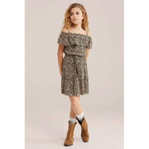 Met deze WE Fashion meisjes jurk is je kind in één keer aangekleed. De jurk heeft een off shoulder halslijn met smalle schouderbandjes en een soepele pasvorm. De bruin/zwarte all over print geeft een speelse uitstraling die bij veel gelegenheden past, van schooldag tot familiebezoek. Gemaakt van 100 procent viscose voelt de stof licht en zacht aan op de huid, praktisch voor dagen waarop veel bewogen en gespeeld wordt.Comfortabele details voor elke dag Off shoulder model met elastische boothals voor een moderne uitstraling Smalle spaghettibandjes zorgen dat de jurk goed blijft zitten Strikceintuur in de taille voor een verstelbare en nette pasvorm Zonder sluiting, zodat de jurk gemakkelijk aan en uit te trekken is Lichte, soepelvallende stof van 100 procent viscose voor comfortabel draagcomfort All over print in bruin/zwart die goed combineert met sandalen, gympen of laarsjesEen jurk voor school, feest en vakantieDeze off shoulder jurk past goed bij het dagelijkse leven van peuter, kleuter, schoolkind of tiener. Geschikt voor warmere dagen, in combinatie met sneakers en een spijkerjack, of met een vest als het wat frisser is. De luchtige stof en het gemakkelijke model maken de jurk geschikt voor drukke dagen vol spel en plezier.Stijl volgens WE FashionWE Fashion staat voor toegankelijke mode met doordachte details. De kinderkledingcollecties zijn ontworpen om goed te combineren en lang mee te gaan in de garderobe, met modellen die comfortabel zitten en er eigentijds uitzien. Zo wordt aankleden een stuk eenvoudiger, voor jou en voor je kind.Een praktische keuze als je op zoek bent naar een luchtige meisjesjurk die zowel praktisch als eigentijds is.