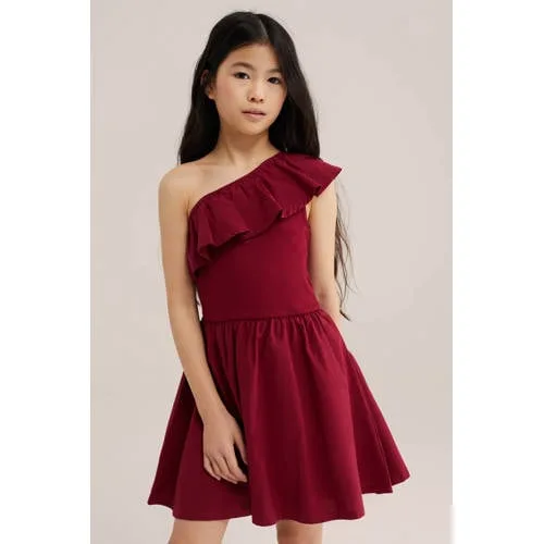 Voor kleine meisjes die graag gezien worden, is deze meisjes one-shoulder jurk van WE Fashion een opvallende keuze. Het bovenstuk is gemaakt van ribstof met elastische one-shoulder band en ruches, waardoor de jurk soepel aansluit en goed blijft zitten. De rok is tweelaags, valt licht geplooid en beweegt mee bij elke stap en draai. In de effen rode kleur valt deze jurk op bij allerlei momenten, van schoolfeest tot familie-etentje.Handige details voor elke dag Gemaakt van 97% katoen / 3% elastaan voor een zachte stof met lichte stretch Ribstof bovenstuk met elastische one-shoulder band voor een comfortabele pasvorm Tweelaagse, licht geplooide rok die soepel mee beweegt Ruches langs de hals en schouder voor een speelse uitstraling Effen rode kleur die makkelijk te combineren is met vestjes en sneakers Mouwloos model zonder sluiting, kan eenvoudig over het hoofd aan en uitKlaar voor optredens en feestjesDeze jurk past goed bij de dagelijkse garderobe van peuter, kleuter, schoolkind en tiener. Geschikt voor een optreden, feestje of een dag waarop jouw kind iets speciaals wil dragen. Door de soepele stof en het ontbreken van knopen of ritsen is de jurk praktisch in gebruik.WE Fashion voor kinderenWE Fashion biedt moderne collecties voor het hele gezin, met aandacht voor pasvorm en draaggemak. De kinderkleding is ontworpen voor dagelijks gebruik, met materialen die prettig aanvoelen en designs die meegaan met de tijd. Zo combineert dit merk eigentijdse stijl met praktische details waar jij en je kind iets aan hebben.Een rode jurk die dankzij de kleur en afwerking geschikt is voor zowel schooldagen als speciale gelegenheden.