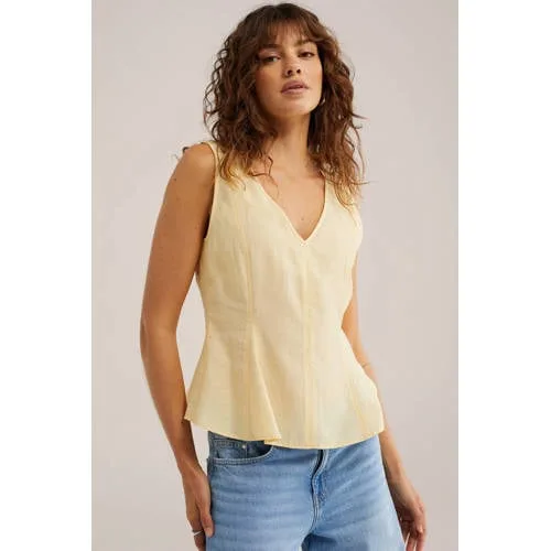 Breng zachte kleur in je garderobe met deze lichtgele dames peplum top van WE Fashion. De top heeft een vrouwelijke V-hals en een speelse peplum aan de onderkant, waardoor er een subtiele nadruk op je taille ontstaat. De effen kleur maakt het een rustige basic voor elke dag, terwijl de vorm net wat extra karakter geeft. Ideaal voor zomerse dagen waarop je licht en verzorgd voor de dag wilt komen.Lichte stof met vrouwelijk silhouet Gemaakt van 77% viscose, 19% polyamide en 4% linnen voor een soepele en luchtige feel Mouwloos model, prettig op warme dagen of onder een vest V-hals die je halslijn mooi laat uitkomen Peplum detail aan de onderzijde voor een licht uitlopende pasvorm Effen lichtgele kleur die makkelijk combineert met denim, wit of zachte neutraaltintenVoor je dagelijkse zomerse outfitsDeze top past goed bij je dagelijkse zomerlook. Combineer met een rechte jeans of korte broek voor een casual outfit, of draag de peplum top op een soepele midi rok voor een iets gekledere uitstraling. Ook fijn onder een licht vest of blazer als het in de avond afkoelt.WE Fashion: moderne basics voor elke dagWE Fashion staat bekend om modieuze kleding met een toegankelijke stijl. De collecties sluiten aan op het dagelijks leven, met items die prettig dragen en makkelijk te combineren zijn. Zo stel je zonder moeite outfits samen die passen bij jouw agenda.Een lichte, zomerse top die je garderobe op een rustige manier opfrist.