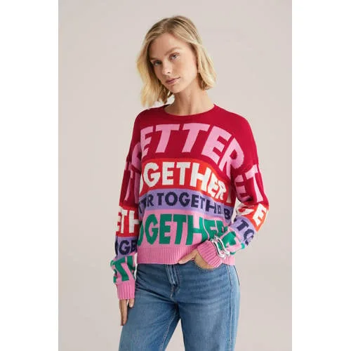 Samen is alles gezelliger. Deze trui heeft een regular fit, ronde hals en lange mouwen. De all-over ‘Better Together’-tekstprint verschijnt in meerdere vrolijke kleuren. Extra leuk: er zit een gratis mini-versie bij de trui als kerstornament.