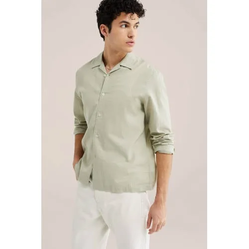 Dit effen overhemd van WE Fashion in de kleur agave is een fijne basis voor elke dag. Het linnen heren overhemd met reverskraag heeft een relaxed karakter door de open reverskraag en de regular fit, waardoor het soepel langs het lichaam valt zonder strak te zitten. De lange mouwen en lichte stof maken het een comfortabele keuze voor zowel op kantoor als in je vrije tijd.Details die je elke dag draagt Gemaakt van een luchtige stof met linnen voor een frisse, ademende feel Regular fit voor een ontspannen pasvorm met voldoende bewegingsruimte Reverskraag geeft het overhemd een moderne, open uitstraling Lange mouwen met knoopsluiting bij de manchetten Volledige knoopsluiting aan de voorkant Effen uitvoering in de kleur agave voor een rustige, makkelijk te combineren look Zonder borstzak voor een strakke, rustige voorkantCasual combineren, van weekend tot werkDit casual overhemd uit de Daily collectie is bedoeld voor alledag. Draag het los over een T-shirt met een chino of jeans voor een ontspannen look, of sluit alle knopen voor een iets nettere stijl. De lichte stof voelt prettig aan op warme dagen en laat zich eenvoudig laag over laag dragen als het koeler is.WE Fashion als vertrouwde basisWE Fashion staat bekend om moderne kleding voor het hele gezin, met toegankelijke ontwerpen die goed aansluiten op het dagelijks leven. Dit overhemd past daar naadloos in, met een heldere pasvorm en materialen die gericht zijn op draaggemak, zodat je garderobe overzichtelijk en toch eigentijds blijft.Een veelzijdig overhemd dat je stijlvol de dag door helpt, van eerste afspraak tot laatste borrel.