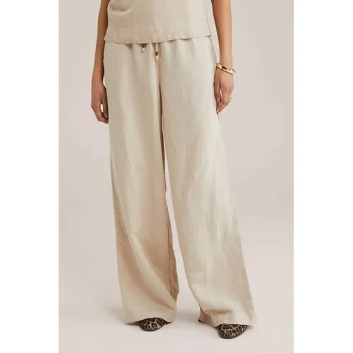 Deze damesbroek van WE Fashion heeft een loose fit en is perfect voor casual gelegenheden. Gemaakt van viscose en linnen in de kleur warm sand, met een elastische tailleband en koordsluiting. Handig zijn de zijzakken.