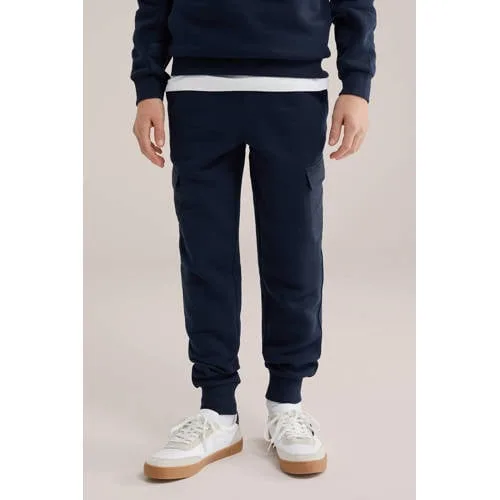 Klaar voor actie op het schoolplein, thuis of tijdens sportieve momenten met deze donkerblauwe WE Fashion jongens joggingbroek in cargostyle. De broek heeft een slanke pasvorm met smalle pijpen en is gemaakt van zachte sweatstof. Zo ziet je kind er verzorgd uit en kan hij toch vrij bewegen, de hele dag door.Cargostyle met praktische details Slim fit met smalle pijpen voor een moderne, aansluitende look Gemaakt van 80% katoen en 20% polyester voor een zachte en stevige kwaliteit Elastische tailleband met koord voor een verstelbare en comfortabele taille Twee steekzakken en twee cargozakken met klittenbandsluiting, waarvan één met tekstprint Geribde boorden aan de pijpen zodat de broek netjes op de schoenen aansluit Effen donkerblauwe kleur, makkelijk te combineren met T-shirts, hoodies en sweatersVoor elke dag en elk avontuurDeze joggingbroek is geschikt voor dagelijks gebruik. De stevige sweatstof kan goed tegen een actieve dag en de cargozakken bieden ruimte voor kleine spullen zoals een sleutel of kaartje. De elastische taille met koord maakt aan- en uittrekken eenvoudig, ook voor kinderen die graag zelf hun kleding regelen.WE Fashion, vertrouwd in kinderkledingWE Fashion staat bekend om eigentijdse kleding met aandacht voor pasvorm en draaggemak. De collecties voor kinderen zijn ontworpen met oog voor beweging en praktisch gebruik, zodat elk item prettig zit en lang meegaat. Zo combineer je stijl en comfort op een toegankelijke manier.Een sportieve basisbroek die moeiteloos meegroeit met de drukke dagen van je kind.