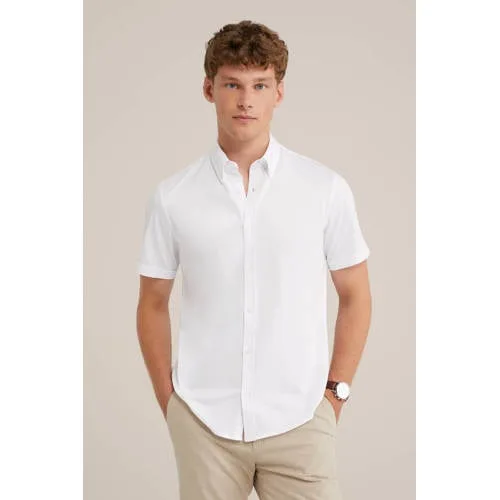 Ontdek het gemak van moeiteloze stijl. Dit slim fit overhemd is gemaakt van een katoenmix en heeft een knoopsluiting, button down-kraag, stretch en korte mouwen. Dankzij de zachte stof, hoeft het item (bijna) niet gestreken te worden, en biedt deze het comfort van je favoriete T-shirt.
