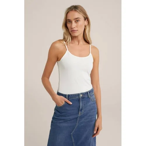 Omarm jezelf in subtiele verfijning. Dit nauwsluitende singlet van zacht katoen biedt verstelbare spaghettibandjes, voor een perfecte pasvorm op maat.