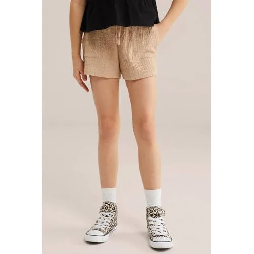 Voor ontspannen dagen is deze beige korte broek voor meisjes een praktische basic. De short heeft een relaxed fit, waardoor er genoeg bewegingsvrijheid is om te rennen, spelen en loungen. De grove crinkle-structuur geeft een speels effect en zorgt voor een casual look. Strijken is niet nodig, de stof valt vanzelf mooi.Comfortabele details voor elke dag Relaxed fit die luchtig en comfortabel zit, ideaal voor warme dagen Elastische tailleband met koord zodat de taille prettig aansluit Steekzakken aan de voorkant voor kleine schatten of een haarelastiek Gemaakt van 97% geweven materiaal en 3% elastaan voor een soepele, licht rekbare touch Effen beige kleur die makkelijk combineert met T-shirts, tops en sweaters Crinkle-structuur die zorgt voor een speelse uitstraling en weinig onderhoudIdeaal voor peuter, schoolkind en tienerDeze casual short past bij de dagelijkse garderobe van peuters, kleuters, schoolkinderen en tieners. Combineer met een luchtig T-shirt en sandalen voor een zomerse dag, of met een sweater en sneakers als het wat frisser is. De elastische taille maakt aan- en uittrekken eenvoudig, ook voor kinderen die graag zelf aankleden.WE Fashion voor kidsWE Fashion staat bekend om moderne, draagbare collecties voor elke dag. De kinderlijn sluit aan op het actieve leven van kinderen, met aandacht voor pasvorm en praktische details. Zo ontstaat kleding die prettig zit, er verzorgd uitziet en makkelijk te combineren is met andere favorieten uit de kast.Een comfortabele short die je kind gemakkelijk uit de kast pakt.