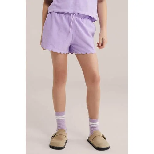 Altijd klaar voor een nieuwe ronde spelen, zwemmen of fietsen met deze meisjes badstof short in lila. De short is gemaakt van zachte badstof van 100% katoen en heeft een relaxed fit, waardoor er genoeg ruimte is om te rennen, klimmen en springen. De elastische taille met koordje zorgt ervoor dat de short goed blijft zitten, ook als de dag vol beweging zit.Comfortabele short voor actieve dagen Zachte badstof van 100% katoen voor een comfortabel gevoel op de huid Relaxed fit geeft extra bewegingsvrijheid tijdens spelen en sporten Elastische tailleband met koord voor een stevige, maar flexibele pasvorm Steekzakken aan de voorkant om kleine vondsten of een sleutel in te bewaren Decoratieve boord en subtiel gerafelde details bij de pijpen voor een speelse look Effen lila kleur die gemakkelijk te combineren is met T-shirts, tops en bikini'sVan strand tot speeltuinDeze badstof short is ideaal na het zwemmen, omdat de stof prettig aanvoelt op een licht vochtige huid. Ook voor een middag in de speeltuin of een zomerse schooldag is dit een fijne keuze. De short is verkrijgbaar voor peuters, kleuters, schoolkinderen en tieners, zodat zussen eventueel in dezelfde stijl kunnen lopen.Vertrouwde stijl van WE FashionWE Fashion staat bekend om moderne kleding met doordachte details voor elke dag. De collectie voor kinderen sluit aan op een actief leven, met comfortabele pasvormen en materialen die prettig dragen. Zo combineer je gemak met een verzorgde uitstraling.Een zachte, praktische short voor dagen vol waterpret en buiten spelen.