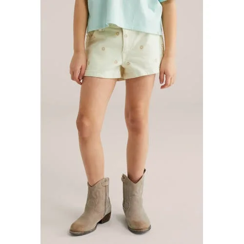 Bloemen en denim komen samen in deze meisjes denim short van WE Fashion. De ecru kleur met lichtgele details geeft een frisse, zomerse uitstraling en laat de all-over bloemenborduursels duidelijk naar voren komen. De short heeft een relaxed fit met rechte pijpen, waardoor er genoeg ruimte is om te bewegen, rennen en spelen.Vrolijke details en praktische pasvorm Relaxed fit met rechte pijpen voor comfortabel draagplezier All-over bloemenborduursels als decoratief detail Rits- en knoopsluiting aan de voorkant Zakken voor en achter om kleine spullen in mee te nemen Gemaakt van katoen met een beetje stretch voor een soepele fit Ecru/lichtgele kleur die makkelijk combineert met tops en T-shirtsVoor elke dag vol bewegingDeze denim short past goed bij het dagelijkse leven van peuter tot tiener. Geschikt voor school, een dagje weg of gewoon buitenspelen. De stof voelt stevig aan en de lichte stretch zorgt dat de short fijn meebeweegt. Combineer met een T-shirt en sneakers voor een casual look.WE Fashion voor kidsWE Fashion ontwerpt toegankelijke mode voor het hele gezin. De kinderkleding is gemaakt met oog voor pasvorm, comfort en draagmomenten door de dag heen. Met deze denim short kies je voor een doordacht ontwerp dat zowel verzorgd oogt als praktisch is in het dagelijks gebruik.Een zomerse short die klaar is voor actieve dagen.