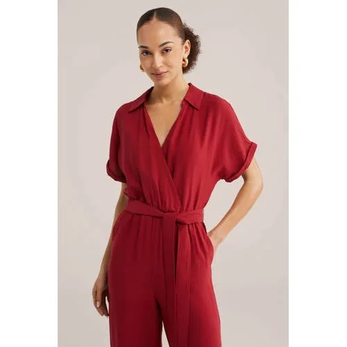 Met deze rode dames jumpsuit ben je in één keer aangekleed van top tot teen. Het model heeft een regular fit en een effen kleur, waardoor het eenvoudig te combineren is met je favoriete schoenen en accessoires. De V-hals en kraag geven een verzorgde uitstraling, terwijl de korte, rechte mouwen zorgen voor luchtig draagcomfort op warmere dagen.Details die het verschil maken Regular fit jumpsuit met rechte pijpen voor een ontspannen silhouet Kraag en V-hals voor een nette, vrouwelijke look Elastiek in de taille met strikceintuur voor een aansluitende pasvorm Twee zijzakken die handig zijn voor kleine essentials Effen rode kleur, geschikt voor zowel werk als vrije tijd Zachte stof met soepel gevoel, geschikt om de hele dag te dragen Geen sluiting, je stapt er eenvoudig in en uitVoor dagelijkse outfits en speciale momentenDeze jumpsuit komt goed van pas op dagen waarop je weinig tijd hebt om na te denken over je outfit. Voor een ontspannen dag combineer je het model met sneakers of sandalen. Voor een etentje of een afspraak kies je voor een hak en een subtiele ketting, zodat de V-hals mooi uitkomt.WE Fashion, hedendaagse stijl voor elke dagWE Fashion staat bekend om eigentijdse kleding die goed aansluit op het dagelijks leven. De collecties combineren draagbaarheid met moderne details, zodat je met weinig moeite verzorgd voor de dag komt. Met deze jumpsuit haal je een veelzijdig kledingstuk in huis dat past bij verschillende gelegenheden in jouw week.Een praktische basis voor dagen waarop je eenvoudig en stijlvol gekleed wilt zijn.