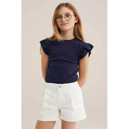 Altijd in beweging en toch goed aangekleed, dat kan met dit donkerblauwe meisjes T-shirt met ruches van WE Fashion. Het model heeft een slim fit en een ronde hals, waardoor het mooi aansluit zonder strak te voelen. De korte vlindermouwen met ruches geven een speels effect dat past bij zowel een gewone schooldag als een feestje. De fijne ribstructuur met stretch maakt dat elke sprong, sprint of danspas soepel gaat.Fijne details voor elke dag Donkerblauw T-shirt, makkelijk te combineren met jeans, rok of short Slim fit pasvorm die mooi aansluit op het lichaam Ronde hals die prettig rondom de nek valt Korte vlindermouwen met ruches voor een speels effect Gemaakt van 95% katoen / 5% elastaan voor een zachte, rekbare stof Fijne ribstructuur die mee beweegt en goed in model blijft Effen design zonder print, ideaal als basis in de kledingkastHandig voor drukke schooldagenDit T-shirt past bij peuter, kleuter, schoolkind en tiener en sluit goed aan bij de dagelijkse garderobe. Draag het op een joggingsbroek voor gym, op een jeans naar school of met een vrolijke rok voor een verjaardag. De stretch in de stof zorgt dat omkleden snel gaat en dat spelen, rennen en klimmen comfortabel blijft.WE Fashion voor kidsWE Fashion ontwerpt kinderkleding die er verzorgd uitziet en tegelijk praktisch is in het dagelijks leven. De collecties zijn afgestemd op dagen vol school, sport en spelen, met aandacht voor pasvorm en draaggemak. Zo is dit T-shirt een praktisch basisitem in de kast.Een veelzijdig donkerblauw T-shirt dat geschikt is voor elke dag.