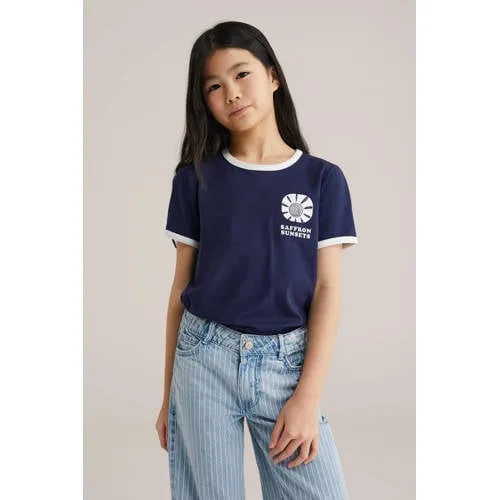 Breng wat extra vrolijkheid in de dag met dit donkerblauwe WE Fashion T-shirt meisjes. Het shirt heeft een slim fit die mooi aansluit, zonder strak aan te voelen. De ronde hals en korte mouwen geven een tijdloze basis, terwijl de contrasterende randen langs de mouwen en de kleine tekstprint op de borst zorgen voor een speels detail. Dankzij de zachte katoenmix met een beetje elastaan blijft het T-shirt comfortabel meebewegen bij alles wat er op een dag gebeurt.Details die elke dag kloppen Donkerblauw T-shirt met subtiele tekstprint op de borst Slim fit pasvorm die netjes aansluit Korte, rechte mouwen met contrasterende randen Gemaakt van 95% katoen en 5% elastaan voor zachtheid en stretch Ronde hals die comfortabel om de nek valt Geschikt om los te dragen of onder een vest of jasjeMakkelijk te combineren in elke outfitDit T-shirt is een praktische basis voor schooldagen, logeerpartijtjes of ontspannen weekenden thuis. Het donkerblauw laat zich eenvoudig combineren met een jeans, rok of korte broek en kan zowel casual als iets netter gedragen worden.De stijl van WE FashionWE Fashion staat voor eigentijdse kleding met aandacht voor pasvorm en draagcomfort. De collecties sluiten aan op het dagelijks leven, zodat kinderen zich vrij kunnen bewegen en er toch verzorgd uitzien. Met dit T-shirt haal je een betrouwbare garderobe-basic in huis.Een comfortabel T-shirt voor alledaags gebruik.