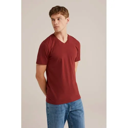 - Bij wefashion.com kun je WE Fashion - Heren Slim fit T-shirt met V-hals - Slim Fit - Roestbruin - Katoen - kopen voor slechts €10,00