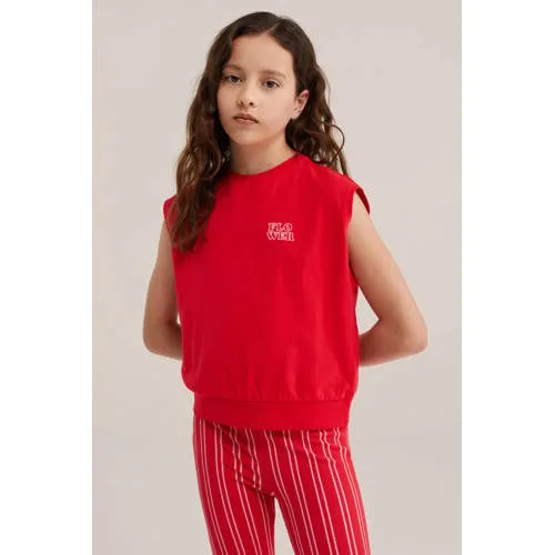 Zoek je een top die er van voren rustig uitziet en van achter net even extra opvalt? Dit katoenen meisjes singlet van WE Fashion combineert een eenvoudige basis met opvallende details. Het singlet heeft een regular fit, een ronde hals en is mouwloos, fijn voor warme dagen of onder een vest. De rode kleur geeft meteen een heldere uitstraling. Op de borst staat een subtiel flower-borduursel en op de rug komt de bloemenprint groot terug als opvallende backprint.Opvallende details voor elke dag Gemaakt van 100% katoen, voelt zacht en luchtig aan op de huid Regular fit, voor een comfortabele pasvorm bij peuter, kleuter, schoolkind en tiener Mouwloos model met ronde hals, ideaal voor zomerse dagen of onder een laagje Flower-borduursel op de borst en grote backprint voor een casual look Geribde boorden bij de hals voor een nette afwerking en extra vormbehoudGemakkelijk te combineren in haar garderobeDit rode singlet past eenvoudig bij haar shorts, rok of jeans. Draag het op zichzelf op een zonnige dag of onder een blouse of vest wanneer het wat frisser is. De backprint geeft elke outfit net iets meer karakter.WE Fashion voor moderne kidsWE Fashion maakt kinderkleding die goed voelt, er netjes uitziet en gemakkelijk te combineren is. De collecties zijn afgestemd op het dagelijkse leven van kinderen, met aandacht voor pasvorm, kleur en praktische details. Zo kies je iets waar zij zich vrij in kan bewegen en dat tegelijkertijd een verzorgde uitstraling heeft.Een praktische basic met een verrassende achterkant, geschikt voor al haar dagelijkse activiteiten.