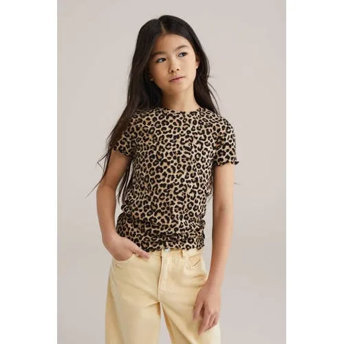 Dit bruine WE Fashion T-shirt voor meisjes is een speelse basis voor elke dag. De all-over luipaardprint geeft direct karakter, terwijl de slim fit pasvorm mooi aansluit op het lichaam. Dankzij de rekbare ribstof voelt het T-shirt zacht en soepel aan, ideaal voor actief spelen, naar school of een dagje weg.Speelse details en comfortabel materiaal Gemaakt van 95% katoen en 5% elastaan, voor een zachte stof die meerekt met elke beweging Rekbare ribstof die fijn aanvoelt op de huid en goed in model blijft All-over dierenprint met luipaardmotief voor een stoere, speelse look Slim fit model dat mooi aansluit zonder strak aan te voelen Korte, rechte mouwen met ruches langs de rand voor een extra meisjesachtige touch Ruches langs de onderzijde zorgen voor een sierlijke afwerking Ronde hals die makkelijk over het hoofd gaat en prettig draagt Per stuk verpakt, handig als favoriete basic in de kastIdeaal voor school, spelen en logeerpartijtjesDe stretchy stof maakt dit T-shirt geschikt voor drukke dagen vol spel en beweging, terwijl de luipaardprint het geheel net wat specialer maakt.WE Fashion voor dagelijkse favorietenWE Fashion staat bekend om moderne kleding met een toegankelijke stijl. De collecties zijn afgestemd op het dagelijkse leven, met veel aandacht voor pasvorm en draagcomfort. Zo ontstaat kleding waar kinderen graag naar grijpen en die ouders met vertrouwen kunnen kiezen.Een stoer en zacht T-shirt als vaste basis in de kledingkast.