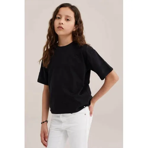 Dit zwarte meisjes T-shirt van katoen is een praktische basic voor elke dag. Het shirt heeft een regular fit, een ronde hals en korte rechte mouwen. De subtiele borduursels op de mouwboorden geven het effen design net wat extra detail. Gemaakt van 100% katoen voelt het materiaal zacht aan en is het geschikt voor peuters, kleuters, schoolkinderen en tieners.Details die het verschil maken Gemaakt van 100% katoen, zacht en ademend voor dagelijks draagcomfort Regular fit, ideaal om vrij in te bewegen Ronde hals die mooi aansluit zonder te strak te zitten Korte rechte mouwen met borduursels op de boorden voor een speels detail Effen zwarte kleur, makkelijk te combineren met verschillende outfits Geschikt voor de Daily collectie, geschikt voor alledaags gebruik Zonder zakken, waardoor het T-shirt een rustige, eenvoudige uitstraling heeftElke dag makkelijk combinerenDit T-shirt past eenvoudig bij een jeans, rok of short en kan zowel los gedragen worden als in de broek of rok gestopt. De effen zwarte kleur maakt het een praktische basis in de kledingkast, zodat het T-shirt een logische keuze is voor schooldagen en vrije tijd.Stijl van WE FashionWE Fashion staat voor eigentijdse kleding met aandacht voor pasvorm en draaggemak. De kindermodecollecties sluiten aan bij het dagelijks leven van kinderen, met items die prettig zitten en er modern uitzien. Zo wordt aankleden net even makkelijker en blijft de stijl toch verzorgd.Een comfortabele basic die goed aansluit bij de dagelijkse routine.