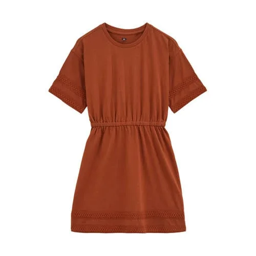Deze katoenen jurk voor meisjes van WE Fashion is een praktische basic voor elke dag. De jurk heeft korte mouwen, een ronde hals en een comfortabele pasvorm die soepel meebeweegt. De kleur 'Star Anise' geeft een rustige, moderne uitstraling en de subtiele borduursels zorgen net voor dat extra detail zonder druk te ogen. Dankzij de T-shirtstijl voelt de jurk luchtig aan en is hij makkelijk te dragen in verschillende seizoenen.Comfortabele details voor elke dag Gemaakt van katoen in single jersey kwaliteit van 180 GSM, voelt zacht en soepel aan op de huid Korte lengte en T-shirtmodel, ideaal voor dagelijks gebruik Korte, rechte mouwen voor extra bewegingsvrijheid Elastische tailleband voor een mooie, comfortabele aansluiting zonder knopen of ritsen Effen kleur met borduursels voor een rustige maar speelse look Geen zakken voor een glad silhouet dat soepel langs het lichaam valt Geschikt voor peuters, kleuters, schoolkinderen en tieners binnen de Daily collectieGeschikt voor school, thuis en daarbuitenDeze jurk is praktisch voor drukke ochtenden. De jurk gaat snel aan en uit, de elastische tailleband sluit meteen goed aan en de zachte stof voelt comfortabel tijdens spelen, naar school gaan of een dagje weg. Combineer met sneakers of sandalen en eventueel een legging op koelere dagen.WE Fashion voor moderne kidsWE Fashion staat bekend om eigentijdse collecties met draagbare ontwerpen voor kinderen. De focus ligt op comfortabele pasvormen en fijne materialen die passen bij het dagelijks leven. Met deze jurk kies je voor een kledingstuk dat er verzorgd uitziet en tegelijk praktisch is in het gebruik.Een rustige, zachte jurk die makkelijk combineert en ideaal is voor elke dag.