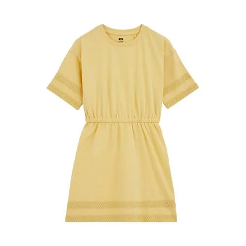 Deze luchtige katoenen meisjes jurk van WE Fashion is gemaakt voor actieve dagen vol beweging. De buttermilk kleur geeft een zachte, frisse uitstraling, terwijl de rechte pasvorm en T-shirtlook zorgen voor veel draaggemak. De jurk heeft een ronde hals en korte mouwen, zodat je kind zich vrij kan bewegen tijdens spelen, naar school gaan of logeerpartijtjes.Comfortabele details voor elke dag Gemaakt van 100% katoen in single jersey kwaliteit, voelt zacht en soepel aan op de huid T-shirtmodel met korte, rechte mouwen voor een ontspannen pasvorm Elastische tailleband die de jurk mooi laat aansluiten zonder strak te zitten Borduursels zorgen voor een verfijnd, speels detail op de effen stof Effen buttermilk kleur is eenvoudig te combineren met leggings, sandalen of sneakers Geen zakken, waardoor de jurk een rustig en strak silhouet houdt Geschikt voor peuters, kleuters, schoolkinderen en tieners dankzij de brede maatboogIdeaal voor school, spelen en familie-uitjesDeze korte jurk past goed bij de dagelijkse garderobe. Trek er op koelere dagen eenvoudig een vest overheen of combineer met blote benen en sandalen in de zomer. De elastische tailleband maakt zelf aan- en uittrekken makkelijker, ook voor kinderen die graag alles zelf doen.WE Fashion voor moderne kidsWE Fashion ontwerpt kinderkleding met aandacht voor pasvorm, comfort en een moderne stijl. De collecties sluiten aan op het dagelijkse leven van kinderen, met kleding die prettig zit en er verzorgd uitziet. Zo kies je voor een merk dat vertrouwd is in veel gezinnen en goed aansluit op een druk gezinsleven.Een praktische jurk voor alle momenten waarop gemak en een verzorgde look samenkomen.