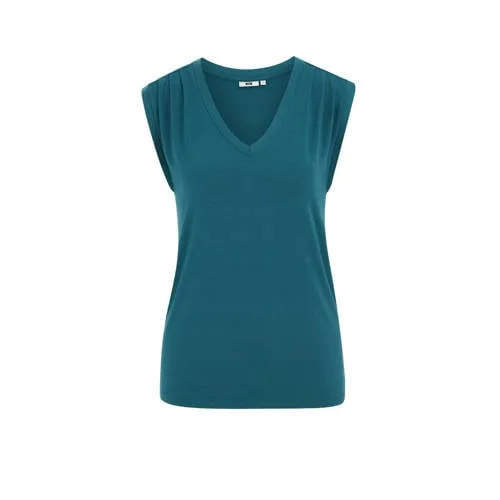 Deze dames top van WE Fashion is een praktische basic voor elke dag. De top is uitgevoerd in de kleur Deep Sea, een diepe blauwtint die rustig oogt en makkelijk te combineren is met je favoriete jeans, pantalon of rok. De soepele stof met 96% viscose en 4% elastaan valt mooi langs je lichaam en beweegt comfortabel met je mee, van werkdag tot weekend.Verzorgde look met comfortabele fit Mouwloos model, ideaal voor het voorjaar of onder een vest of blazer V-hals die je halslijn subtiel accentueert Effen ontwerp, makkelijk te combineren met prints en basics Rechte mouwinzet voor een nette, rustige belijning bij de schouders Zachte, soepele stof dankzij het hoge aandeel viscoseVeelzijdig in je dagelijkse garderobeDe top komt uit de Daily collectie en leent zich goed voor alledaagse outfits. Draag de top op een straight fit jeans met sneakers voor een casual dag of combineer met een blazer en nette broek voor kantoor. In de lente kun je de top ook prima solo dragen, met een luchtig vest bij de hand als het afkoelt.WE Fashion als betrouwbare basisWE Fashion biedt kleding die goed aansluit bij het dagelijks leven. Met aandacht voor pasvorm en draaggemak vind je er items die je moeiteloos combineert en vaak uit de kast pakt.Een praktische keuze die je garderobe op een subtiele manier compleet maakt.