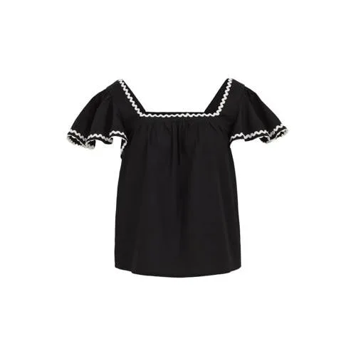 Deze dames top met broderie van WE Fashion is een luchtige basic voor warme dagen, met net wat extra detail. De top heeft een zwarte basis met subtiele witte accenten en een effen uitstraling, waardoor hij makkelijk te combineren is met je favoriete jeans, rok of short. De vierkante hals en sierlijke vlindermouwen geven het ontwerp een vrouwelijke en moderne look.Lichte zomerstof en sierlijke details Gemaakt van 75% katoen voor een zachte, comfortabele touch op de huid Vlindermouwen zorgen voor een luchtig gevoel en veel bewegingsvrijheid Vierkante halslijn geeft een moderne uitstraling en laat sieraden mooi uitkomen Broderie details zorgen voor een verfijnde, zomerse look Effen ontwerp in zwart/wit, ideaal als basisstuk in je garderobe Onderdeel van de 'Daily' collectie, geschikt voor alledaagse outfitsIdeaal voor zomerse dagenDeze top is gemaakt voor de zomer. Draag hem op een lichte broek naar je werk, combineer met een denim short voor een vrije dag of kies een nette rok voor een etentje. De korte mouwen en de luchtige stof maken de top prettig op warme dagen, terwijl de broderie structuur je outfit net iets extra's geeft.WE Fashion in jouw kledingkastWE Fashion staat bekend om eigentijdse kleding met een heldere stijl voor elke dag. De collecties zijn ontworpen met aandacht voor draagbaarheid en een moderne pasvorm. Zo vul je je garderobe eenvoudig aan met stukken die je vaak en graag draagt.Geschikt als lichte, vrouwelijke top voor dagelijks gebruik.