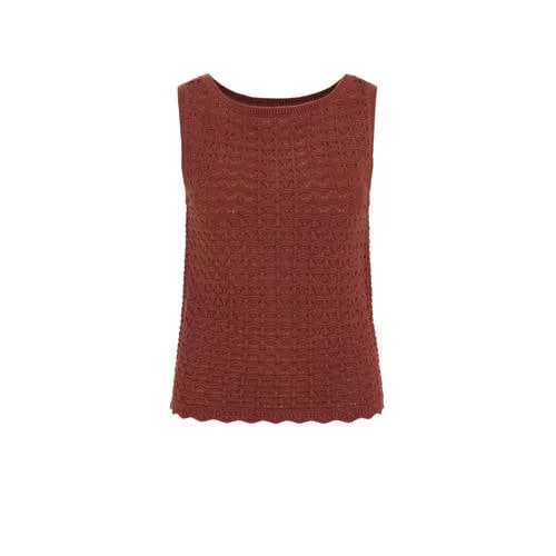 Geef je dagelijkse outfits een rustige basis met deze donkerrode fijngebreide top voor dames van katoen. De top is mouwloos, heeft een ronde hals en is gemaakt van 100% katoen. De zachte, fijn gebreide structuur voelt prettig aan op de huid en de effen kleur maakt combineren eenvoudig. Ideaal voor zomerse dagen of als laagje onder een vest of blazer.Details die je elke dag draagt Mouwloos model, handig voor warme dagen of onder een jasje Ronde hals voor een vrouwelijke, tijdloze uitstraling Gemaakt van 100% katoen voor een zachte en ademende feel Fijn gebreide kwaliteit die soepel valt om het lichaam Effen donkerrode kleur die makkelijk te combineren is Onderdeel van de 'Daily' collectie, ontworpen voor alledaags gebruikVeelzijdig in je garderobeDeze donkerrode top past goed bij een jeans, een luchtige korte broek of een nette pantalon. In de zomer draag je de top los op de huid, in andere seizoenen vormt het een comfortabele basis onder een trui of blazer. Door de effen kleur en rustige vormgeving blijft de top lang onderdeel van je vaste rotatie.WE Fashion als vertrouwde basisWE Fashion staat bekend om moderne, draagbare collecties voor iedere dag. De focus ligt op goede pasvormen, doordachte basics en items die makkelijk te combineren zijn. Met deze top kies je voor een betrouwbaar kledingstuk dat past binnen een garderobe waarin stijl en gemak centraal staan.Een fijne keuze als je zoekt naar een comfortabele, mouwloze top die je het hele seizoen door blijft pakken.