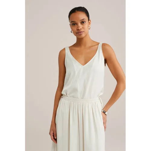 Een comfortabele én stijlvolle basic voor de zomer. Deze singlet heeft een elegante V-hals en is soepelvallend. Gebruik dit item als onderlaag of combineer het met je favoriete onderstukken voor een moeiteloze casual look.