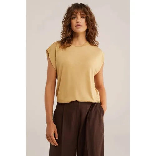 Deze gouden dames top zonder mouwen geeft direct een feestelijke glans aan je outfit, zonder dat het te veel wordt. De top heeft een regular fit en een ronde hals, waardoor de stof mooi langs het lichaam valt en makkelijk te combineren is met verschillende stijlen. In de stof is glittergaren verwerkt, wat zorgt voor een subtiele sprankel die net iets extra's toevoegt op een gewone dag, maar ook perfect is voor een etentje of een feestje.Details die het verschil maken Goudkleurige top met subtiel glittergaren voor een sprankelend effect Regular fit, sluit comfortabel zonder strak te zitten Ronde hals die mooi aansluit bij verschillende sieraden Mouwloos ontwerp, ideaal voor zomerse dagen of onder een blazer Gemaakt van viscose met elastaan voor een soepele stof met lichte stretch Glad, effen design dat rustig oogt, ondanks de glansVan kantoor tot avond uitDeze top past makkelijk in je dagelijkse garderobe. Combineer met een jeans en sandalen voor een ontspannen zomerse look of draag hem in een pantalon met blazer voor een verzorgde werkoutfit. In de avond staat hij mooi op een rok of een zwarte broek, waarbij de gouden glans net wat extra sfeer geeft.WE Fashion: moderne stijl voor elke dagWE Fashion staat voor eigentijdse mode die goed aansluit op het dagelijkse leven. Collecties worden ontworpen met aandacht voor pasvorm en draagbaarheid, zodat je je gemakkelijk kleedt voor werk, vrije tijd en speciale momenten. Met deze top haal je een stijlvol kledingstuk in huis dat past bij de vertrouwde kwaliteit van WE Fashion.Een fijne, glanzende basic die je garderobe het hele seizoen door aanvult.
