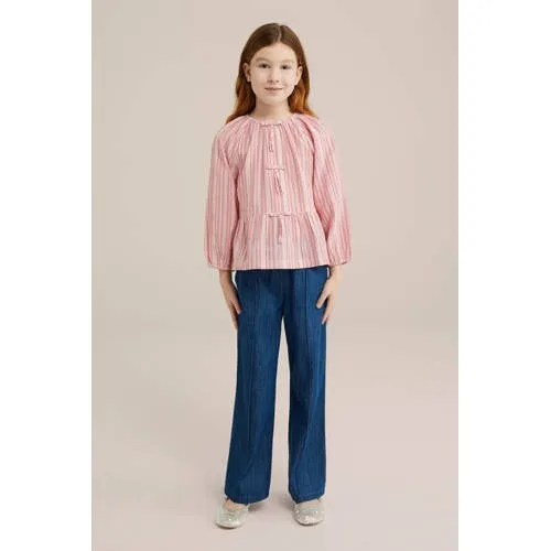 Deze top van WE Fashion voor meisjes heeft lange mouwen en een ronde hals. Gemaakt van stretchkatoen voor een comfortabele pasvorm. Het strikdetail en de plooien geven extra flair, terwijl de pofmouwen een speelse touch toevoegen.