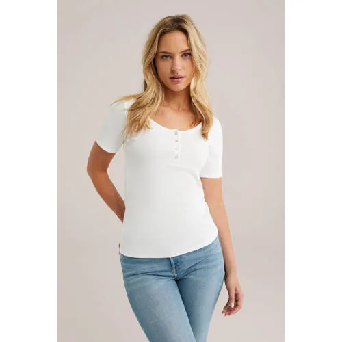 Deze top van WE Fashion heeft korte rechte mouwen en een ronde hals. De top is gemaakt van katoen met elastaan, zit lekker en geeft je genoeg bewegingsvrijheid voor elke dag.