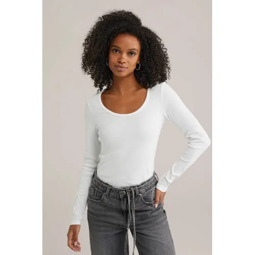 Deze top van WE Fashion heeft lange rechte mouwen en een ronde hals. De top is gemaakt van katoen, voelt prettig aan en past goed bij veel outfits. Je draagt deze graag elke dag.