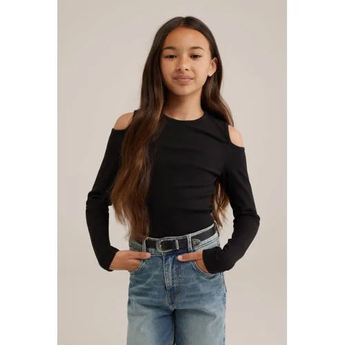Deze top voor meisjes van WE Fashion is gemaakt van een katoenmix. Het model heeft een ronde hals en lange mouwen.details van deze top:open shouldertextuur