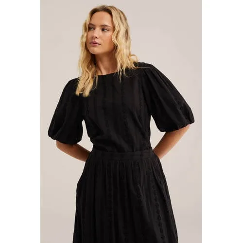 Laat je everyday look extra verzorgd ogen met deze zwarte katoenen dames top met broderie van WE Fashion. De top heeft een ronde hals, driekwart mouwen en subtiele pofmouwen die voor een mooie vorm zorgen. De fijne broderie details geven het effen zwarte ontwerp een luchtige zomerse uitstraling. Door de zachte katoenen voering schijnt de top niet door en voelt de stof prettig aan op de huid, ook op warme dagen.Verfijnde details voor elke dag Gemaakt van 100% katoen, met een zachte voering voor extra comfort Broderie details voor een luchtige uitstraling Driekwart mouwen met pofeffect voor extra vorm bij de schouders Ronde hals die mooi aansluit zonder te hoog te zitten Effen zwarte kleur, makkelijk te combineren met jeans, rok of nette broek Onderdeel van de Daily collectie, geschikt voor dagelijks dragenVeelzijdig in je zomergarderobeDeze zomerse top combineer je eenvoudig met een luchtige linnen broek of je favoriete denim. Geschikt voor op kantoor, een etentje of een vrije dag in de stad. De broderie en pofmouwen zorgen voor extra detail, terwijl de kleur en snit goed aansluiten bij verschillende outfits.WE Fashion, stijl voor elke dagWE Fashion staat voor modieuze basics en doordachte details die je makkelijk combineert. De collecties sluiten aan op het dagelijks leven, met aandacht voor pasvorm, draagcomfort en een eigentijdse uitstraling. Zo bouw je stap voor stap een garderobe op waar je het hele seizoen plezier van hebt.Een basis top die je seizoen na seizoen makkelijk blijft combineren.