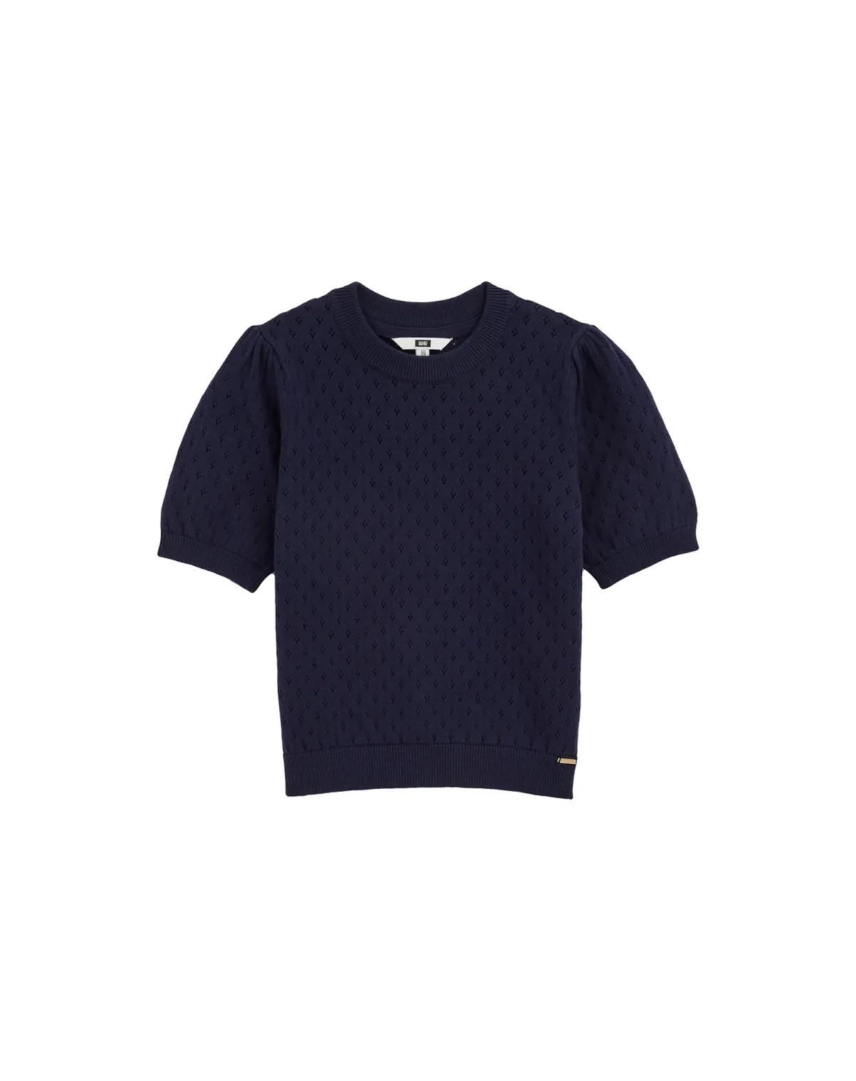 Design: Geribbelde kraag; Materiaal: Knitwear; Halstype: Ronde hals; Motief: Effen; Details: Mesh; Extra's: Fully fashioned; Pasvorm: Normale pasvorm; Armlengte: Halve mouw; Lengte: Normale lengte