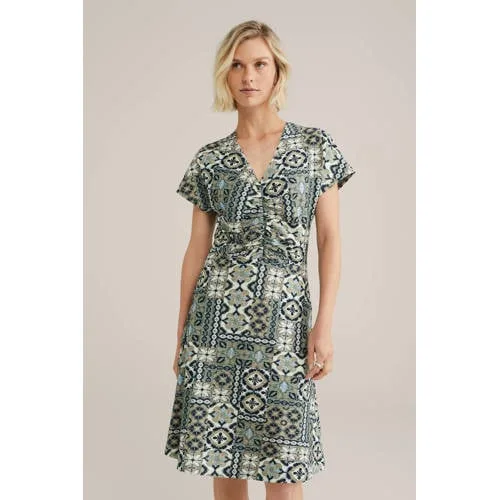 Design: Gevoerde zoom/rand, Rechte zoom; Materiaal: Gerecycled materiaal; Halstype: V-hals; Details: Gedrapeerd; Extra's: All-over patroon, Voelt zacht aan; Lengte: Knielengte; Snit: Getailleerd; Pasvorm: Slanke pasvorm; Armlengte: Kwartmouw