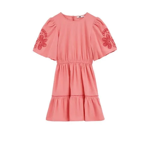 Deze roze WE Fashion meisjes jurk is vrolijk, luchtig en klaar voor drukke dagen vol spel en beweging. De jurk heeft een regular fit, korte lengte en een ronde hals, waardoor de jurk makkelijk over het hoofd aangaat. De pofmouwen met elastiek en de elastische taille geven een speelse vorm, terwijl de subtiele plooien en borduursels zorgen voor een verzorgde uitstraling. Gemaakt van 100% katoen voelt de stof zacht aan en is de jurk geschikt voor warme dagen.Details die het verschil maken Gemaakt van 100% katoen, prettig ademend voor zomerse dagen Regular fit met korte lengte, ideaal om vrij in te bewegen Pofmouwen met elastische boord voor een luchtige, speelse look Elastische taille die netjes aansluit en de jurk mooi laat vallen Enkele knoopsluiting op de rug om gemakkelijk aan en uit te trekken Effen roze kleur met borduursels en contraststiksels als rustige blikvangers Zonder zakken, zodat het silhouet slank en licht blijftFijne jurk voor alledaags en vakantieDeze zomerjurk is geschikt voor school, een feestje of een dagje weg. Het lichte katoen en de korte mouwen maken de jurk praktisch op warme dagen, terwijl de elastische taille en plooien genoeg ruimte bieden om te rennen en spelen.WE Fashion voor het hele gezinWE Fashion staat bekend om toegankelijke mode voor elke dag. Collecties worden ontworpen met aandacht voor pasvorm, draaggemak en actuele trends, zodat kinderen zich vrij kunnen bewegen en ouders kunnen vertrouwen op consistente kwaliteit.Een comfortabele jurk die klaar is voor lange, zonnige dagen vol beweging.