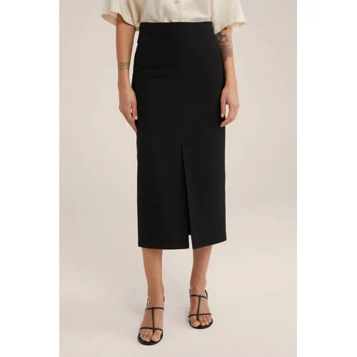 Design: Split; Type sluiting: Ritssluiting; Motief: Effen; Rokvorm: Kokerrok; Extra's: Gladde stof; Lengte: 3/4 lengte; Pasvorm: Normale pasvorm