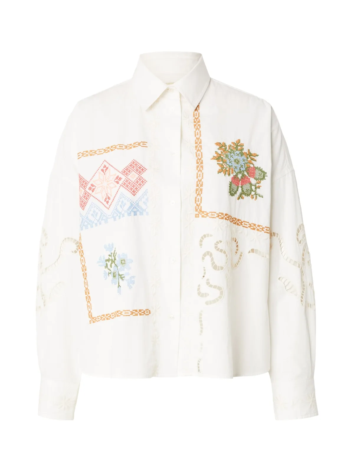 Blouse type: Klassieke blouse; Design: 1-knoops manchetten, Gevoerde zoom/rand, Placket, Overcut schouder; Type sluiting: Knoopsluiting; Materiaal: Katoen; Kraag: Kentkraag; Details: Gedrapeerd, Mesh; Extra's: Op staal naden; Pasvorm: Losse pasvorm; Armlengte: Lange mouw; Lengte: Normale lengte