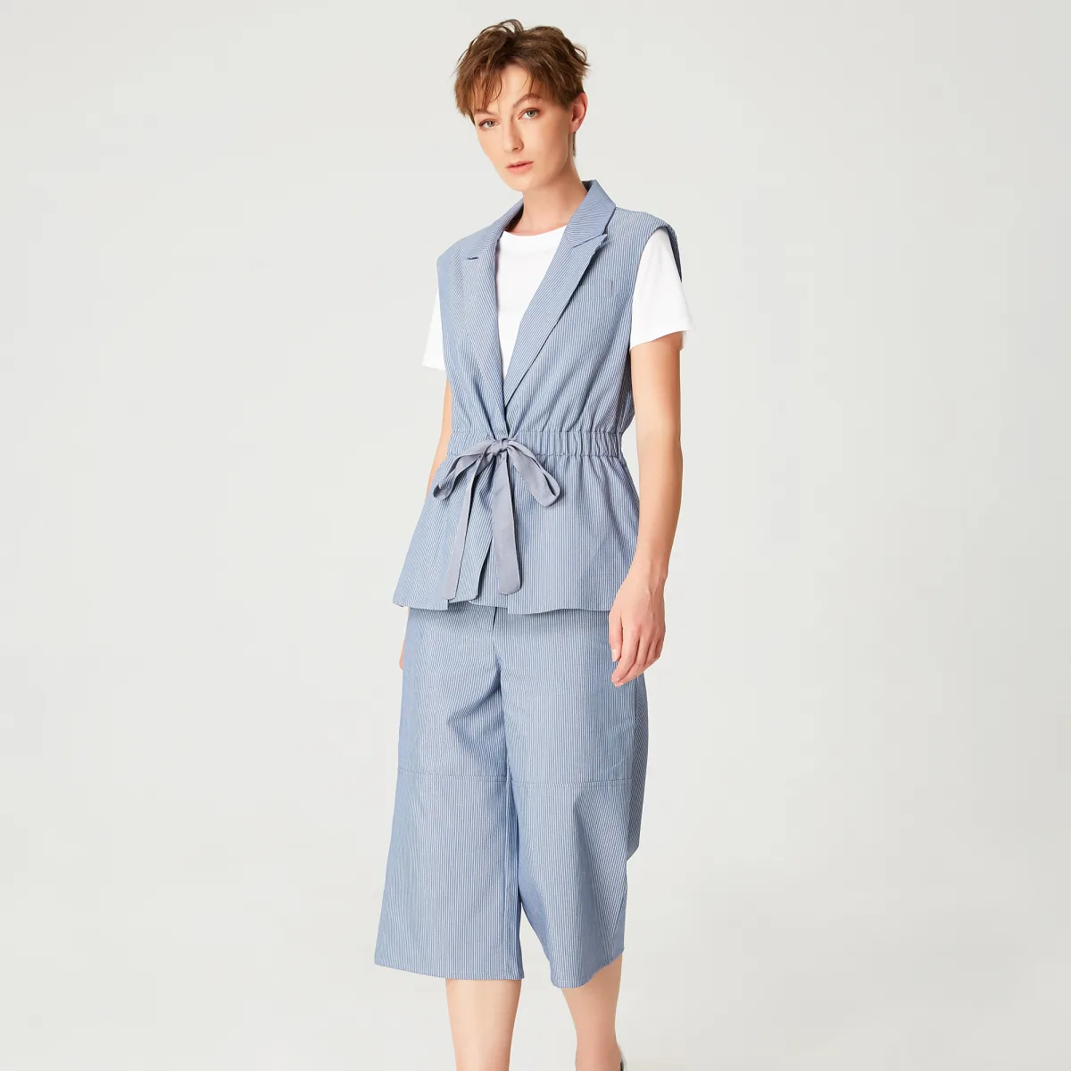 Kraag op maat, eenvoudige knop, trekkoordriem met een lint om te binden of los te laten. Een tijdloos en veelzijdig stuk dat een chique maar moeiteloze uitstraling brengt. Het combineert goed met een eenvoudig T-shirt en jeans voor een informele stijl of met onze "brede capri-broek" die beschikbaar zijn in dezelfde stoffen om de "totale look" te spelen. Productdetails • Vorm: op maat gemaakt, gemonteerd op de taille • Mouwloos • Geklassing • Knop midden voor en lintriem • Lengte: 67 cm