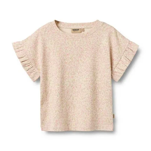 Voor een frisse, speelse look is dit Wheat meisjes T-shirt Ally een praktische basic voor elke dag. Het lichtroze met ecru vormt een zachte combinatie en de all-over bloemenprint geeft het shirt een zachte uitstraling. Gemaakt van 100% katoen voelt de stof soepel en zacht aan op de huid, ideaal voor peuters, kleuters en schoolkinderen die de hele dag in beweging zijn.Vrolijke details en praktisch comfort Gemaakt van 100% katoen, wat prettig aanvoelt en makkelijk te dragen is in elk seizoen Lichtroze/ecru kleur met subtiele bloemenprint voor een zachte, speelse look Korte mouwen met rechte mouwinzet, zodat er genoeg bewegingsvrijheid is tijdens spelen Ronde hals die soepel over het hoofd gaat en prettig aansluit Ruches als sierlijke detail langs het voorpand voor een extra girly uitstraling Onderdeel van een co-ord set, gemakkelijk te combineren met bijpassende items uit dezelfde serieMakkelijk te stylen op drukke dagenDit T-shirt is snel aangetrokken voor school, opvang of een middag buiten spelen. Het combineert eenvoudig met een korte broek, legging of jeans en past ook goed onder een vest op koelere dagen. Zo heb je met weinig handelingen een complete, verzorgde outfit.Scandinavische eenvoud van WheatWheat staat bekend om kinderkleding met een rustige, Scandinavische uitstraling en aandacht voor draaggemak. De ontwerpen hebben vaak zachte kleuren en tijdloze prints, met een verzorgde uitstraling en voldoende bewegingsvrijheid. Met Wheat kies je voor doordachte details en comfortabele materialen voor elke dag.Een T-shirt dat er verzorgd uitziet en aansluit bij het actieve leven van je kind.