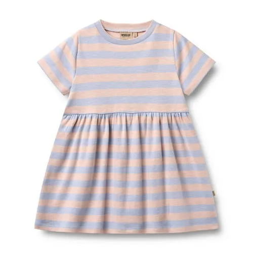 De Wheat meisjes jurk Anna is een luchtige midi jurk met A-lijn pasvorm, ideaal voor speelse dagen. De fijn gestreepte print in blauw en lichtroze geeft een rustige, vrolijke uitstraling. Gemaakt van 100% katoen voelt de stof zacht aan op de huid en blijft je kind de hele dag comfortabel, of zij nu speelt, leest of onderweg is.Zachte stof en doordachte details Gemaakt van 100% katoen voor een soepele, ademende stof A-lijn model met midi lengte voor veel bewegingsvrijheid Korte rechte mouwen, prettig op warmere dagen Ronde hals die comfortabel en kindvriendelijk aansluit Geen sluiting, de jurk wordt eenvoudig over het hoofd aangetrokken Streepprint in blauw en lichtroze voor een rustige, frisse look Plooien geven de rok extra ruimte en een speels effect Geen zakken voor een rustige, gladde uitstraling Geschikt voor peuter, kleuter en schoolkindVoor schooldagen en vrije tijdDeze jurk is praktisch in het dagelijks leven. Het aan- en uittrekken gaat snel, wat handig is op drukke ochtenden. De midi lengte en het A-lijn model bieden genoeg ruimte om te rennen, klimmen en fietsen. Combineer met sandalen of sneakers en eventueel een vest als het frisser wordt.De wereld van WheatWheat staat bekend om kinderkleding met zachte materialen, doordachte pasvormen en tijdloze prints. De ontwerpen zijn gericht op kinderen die vrij willen bewegen en zich prettig willen voelen in wat zij dragen. Met deze jurk kies je voor een betrouwbaar merk dat comfort en een rustige, Scandinavische stijl combineert.Een dagelijkse jurk waar je kind zorgeloos in kan bewegen en spelen.