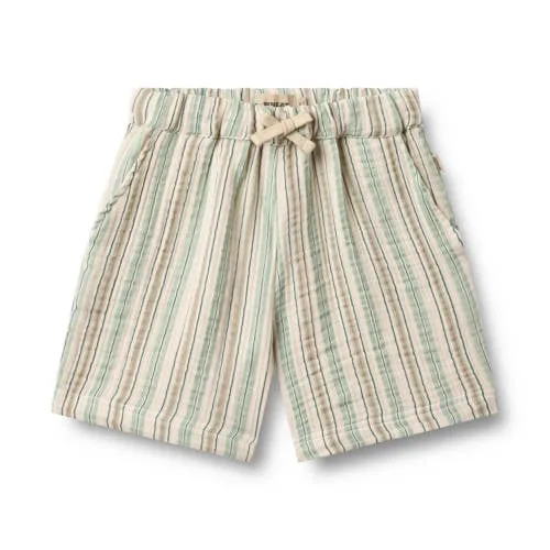 Deze korte broek voor jongens van Wheat is een praktische basic voor warme dagen. De Cuba shorts hebben een groene en beige streep, wat direct zorgt voor een rustige, speelse look. Gemaakt van 100% katoen voelt de stof zacht en luchtig aan, prettig voor peuters, kleuters en schoolkinderen die veel bewegen en spelen.Comfortabele short met subtiele textuur Gemaakt van 100% katoen, wat zacht aanvoelt op de huid Elastische tailleband met koord voor een comfortabele pasvorm Regular waist, zodat de broek prettig op de heup valt Groen/beige streepdessin met lichte textuur in de stof Voorzakken waar kleine schatten of een zakdoek in passen Casual model dat makkelijk meebeweegt tijdens het spelen Onderdeel van een co-ord set, gemakkelijk te combineren met bijpassende items uit dezelfde serieKlaar voor speelplezierDe Cuba shorts zijn geschikt voor school, de opvang of een dag buiten. Het katoenen materiaal blijft prettig aanvoelen, ook als het warm is. De elastische tailleband met koord maakt aan- en uittrekken eenvoudig, wat handig is bij het omkleden of een toiletbezoek.Scandinavische kinderstijl van WheatWheat is een Scandinavisch merk dat kinderkleding ontwerpt met veel aandacht voor pasvorm en draaggemak. De ontwerpen zijn rustig en doordacht, zodat de kleding goed te combineren is in de dagelijkse garderobe. Met deze korte broek kies je voor een doordacht ontwerp dat past bij het dagelijks leven van actieve kinderen.Een praktische, luchtige short voor elke dag waarop kinderen vrij kunnen bewegen en spelen.