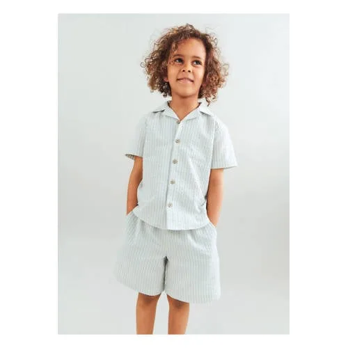 Voor actieve dagen in de speeltuin of op school is een comfortabele korte broek erg praktisch. Deze lichtblauwe korte broek voor jongens van Wheat combineert een luchtige stof met een rustige, zomerse look. De subtiele lichtblauw/ecru strepen en de zichtbare textuur geven de shorts een frisse uitstraling die makkelijk te combineren is met T-shirts en luchtige truien.Licht en comfortabel ontwerp Gemaakt van 100% katoen, voelt zacht aan op de huid en is prettig om de hele dag te dragen Elastische tailleband met koord voor een fijne pasvorm rondom de buik Regular waist, zodat de broek comfortabel op de heup valt Casual model dat genoeg bewegingsvrijheid biedt om te rennen en klimmen Zakken voor, handig voor kleine schatten of een zakdoek Geschikt voor peuters, kleuters en schoolkinderenIdeaal voor zonnige dagenDeze Cuba shorts zijn ideaal op warme dagen. Het luchtige katoen houdt het draaggevoel licht, ook tijdens het spelen of sporten. Door de elastische band kan je kind de broek makkelijk zelf aan- en uittrekken, wat handig is bij het aankleden en op school.Wheat: Scandinavische eenvoud voor kinderenWheat staat bekend om kinderkleding met een zachte uitstraling, doordachte pasvormen en comfortabele materialen. De ontwerpen zijn geïnspireerd op Scandinavische eenvoud en sluiten aan bij het dagelijkse leven van kinderen, met genoeg ruimte om vrij te bewegen en te ontdekken.Een luchtige korte broek die klaar is voor elke zomerse dag vol avontuur.