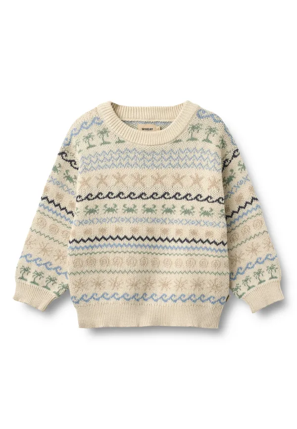WHEAT Trui ‘August’ sand / pastelblauw / groen / zwart Prijzen