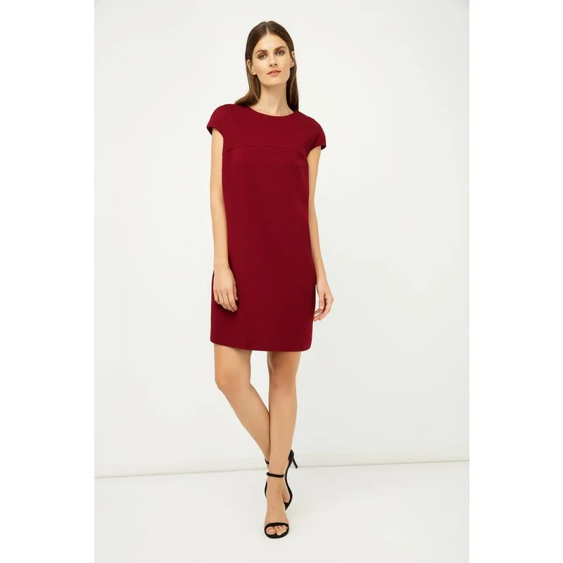 Conquista bordeauxrode wijde jurk met kapmouwtjes en een ronde hals. Sack-stijl jurk in diep bordeauxrode Punto di Roma-stof. Ronde hals en kleine kapmouwtjes. Figuurnaden bij de buste en een afgeronde decoratieve naad erboven. Sluit aan de achterkant met een dikke plastic rits van 50 cm. Zakken aan de zijkanten. Lengte voor maat 38: 90 cm. Onze model is 178 cm lang en draagt maat 36.