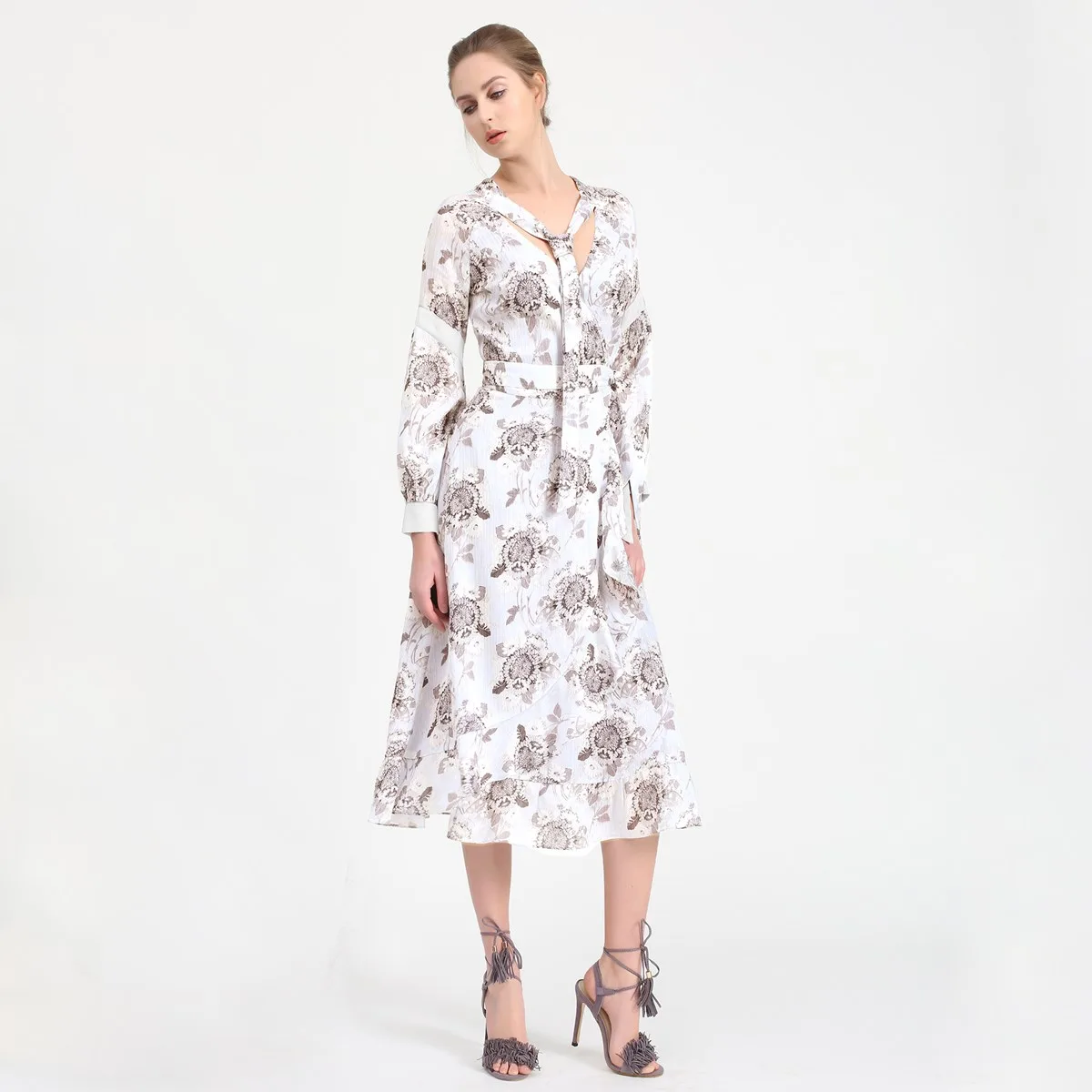 Met een prachtige bloemenprint zal deze moeiteloze echte wrap -jurk romantisme en charisma aan je garderobe toevoegen. Zeer vleiend met zijn diepe V-hals en zijn gevilde volume. Het omarmt de zeer trendy bloemenstijl van het seizoen en wordt verbeterd met mooie ruches van de bodem van de rok. Een must-have dag-tot-nevel-item. Productdetails: • V-neckline • Lange mouwen • Lengte: 127 cm • Bevestigd met wrap -systeem • Model draagt maat 8